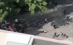 The fight between the two groups broke out at 11.52 am.[3] It involved both parties hurling bricks at each other.[3][10][12][15] The protesters were dressed in black,[6][8][12] wore masks over their faces,[6][14][33] and carried umbrellas used as protection for the fight.[34] The incident lasted for about a minute,[3][12] after which the protesters retreated under the shelter of their umbrellas.[3][12][22]