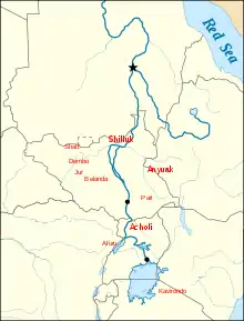 A further division within the Northern Luo is recorded in a "widespread tradition" in Luo oral history:[5] the foundational figure of the Shilluk (or Chollo) nation was a chief named Nyikango, dated to about the mid-15th century. After a quarrel with his brother, he moved northward along the Nile and established a feudal society. The Pari people descend from the group that rejected Nyikango.[6]