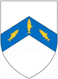 Lupton later became a seat of the Peverell family, which according to the Devon historian Tristram Risdon (d. 1640) occupied it for ten generations.[13] Pole (d.1635) called this family "Peniles" of "Luckton (which) lieth in this parish of Brixham".[14] Vivian (1895) called them "Pennells".[15] John Peverell (alias Pennells, Peniles, etc.) was the last of the male line and his heir was his sister, Agnes Peverell (or Pennells, etc.), wife of John Upton of Puslinch,[15] the descendants from which marriage thus inherited the manor. Pole gave the arms of "Peniles of Luckton" as "Argent, on a chevron azure three fishes or".[16] These arms are visible as the 4th of 8 quarterings of the arms of Sir William Strode (1562–1637) of Newnham on his mural monument in St Mary's Church, Plympton St Mary.