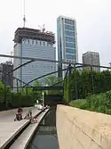 The garden initially had a hardwood footbridge that passes over the shallow water in the canal, and that divides the garden diagonally.[3] However, stories in the sixth year of the garden described steel bridges.[9] The entire garden slopes downward to present itself for the new Renzo Piano Modern Wing addition to the Art Institute of Chicago Building.[6][23] At the foot of the canal opposite the Building the water ends in a pool.[9] Israel's lighting accents the hedges, and pathways are lit by in-ground lighting fixtures.[26] There were complaints that the construction of the Nichols Bridgeway clutters the picturesque view of Lurie Gardens and in so doing diminishes its prairie aspect.[27]