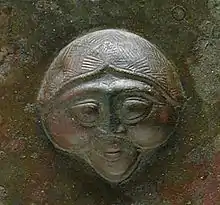 The disk-headed pins are made from sheet metal by repoussé and chasing work, engraving and other techniques, so differing from the types described above, which are cast. Many designs centre on a large face, and in general humans predominate over animals in their decoration, another difference to the other types. The diameter of the disk is typically between 6 and 9 centimetres, and the whole pin and head up to about 20 centimetres. Similar large face designs are found on some other plaques of uncertain purpose.[39]