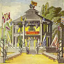 In the 19th century, the Lusthaus, as well as the entire Prater, was a popular meeting place for the nobility and bourgeoisie. During the First World War, the military bridge guard tasked with protecting the Danube bridge from sabotage was stationed in the summer house. In the inter-war period marked by economic instability and poverty, the composition of its patrons shifted; the Lusthaus then served as a bar with dance and music. During the Second World War, the Lusthaus was almost completely destroyed by bombings in 1944 and 1945. However, by 1948, a decision was taken to rebuild the building, and the city of Vienna earmarked a sum of 350,000 schillings for its repair.[1] During reconstruction, the building was restored to its 18th-century shape.[2] In October 1949, the Lusthaus was reopened.