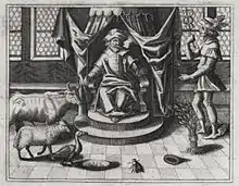 A calf, sheep, goose, oyster, bee, silkworm, flax, and Mercury participate in the contest judged by man. Each of the book's chapters is a dialog in which a representative pleads his case to the judge. The last, and longest case is made by Mercury. In the final chapter, the judge crowns Mercury "king of all worldly things being under the command of man".[1][2][3]