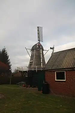 Lutke's Meule was what the Dutch describe as an "achtkante stellingmolen". It was a small smock mill on a single-storey base with a stage at first-floor level,[1] 2.30 metres (7 ft 7 in) above ground level.[2] The base and smock were covered in weatherboards and the cap was covered in Dakleer. The mill was winded by tailpole and winch. The four Common sails had a span of 7.50 metres (24 ft 7 in).[1] The leading edges were streamlined using the Faueël system. The sails were carried in a wooden windshaft.[2] The mill drove one pair of 600 millimetres (2 ft 0 in) diameter millstones.[1]