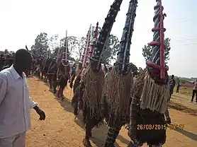 The completion of the mukanda is celebrated with a graduation ceremony, the makishi masquerade. The boys are welcomed back into their community as adult men; the entire village is free to attend the makishi masquerade and pantomime- like performance.[20] After the ritual, the makishi masks are burned or buried, symbolically returning them to the world of the dead. In recent times, masks have incorporated notions of the new; newer representations of makishi might include the face of a boom box, a VCR player, radio, or etc.[21]