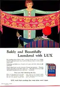 Lux Soap was introduced to America in 1925 by the Lever Brothers.[6] It was a white soap packaged in pastel colors designed to be comparable to the finer French soaps, but more affordable.[7] Once Lux Soap began its national campaign in 1926, it was also advertised for men and children.[7] The Thompson agency then began a campaign in 1928 to get endorsements from Hollywood actresses, by sending 425 actresses cases of Lux Soap. It received 414 endorsements in return, leading them to claim that 9 out of 10 stars in Hollywood use Lux Soap.[7][6]