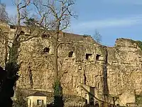 It was in 963 that Count Siegfried, in search of a site from which he could defend his properties, obtained the Bock and its surroundings from St Maximin's Abbey in Trier in exchange for the land he owned at Feulen in the Ardennes to the north. The Romans, then the Franks, had probably already inhabited the Bock although there is only scant archeological evidence of their presence.[1][2] There are however traces of a 4th-century Roman watchtower close to the point in the Fish Market where two major Roman roads used to cross, one from Reims to Trier and the other from Metz to Liège.[3]
