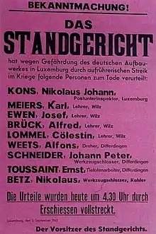 Poster announcing the death sentences of 9 of the 21 Luxembourgers executed for their participation in the 1942 General Strike.