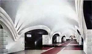Today the station exists as an empty space that can be seen from inside the trains,[5] which slow as they pass, Both widened tunnels for the platform halls are done, but most of the passages to the central hall are still not opened, and the central hall itself is only partially bored through. The original architectural image of the station was to be on par with Lukianivska, both symbolising a break with the Soviet past and a Ukrainian future. The theme for Lvivska Brama would be orientated on Western Ukraine (which would fit in with the name) consisting of sharp, contrasting colour tones. The pylon portals would feature additional white vaults joining at the base of the pylons. Contrasting with this would be the black internal pylon passages. The floor would be arranged in a symmetrical cross pattern of red, white and black granite.