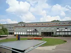 The lycée Paul-Valéry, designed by architects J.C. Dondel and R. Dhuit[1] resembles a number of other lycées built at the start of the 1960s: a single lycée building with repeating windows along its length, multicoloured windows over the yard, and green and orange mosaics on the building's walls.