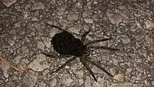 These spiders are rather large, the females being as large as 30 mm (1.18 in) in body length[3] and the males around 19 mm (0.75 in). As with other wolf spiders, the silken sac containing over 100 eggs is carried attached to the mother's spinnerets, and then after they hatch, the spiderlings climb on their mother's abdomen and ride around with her for some time until they are sufficiently mature to survive on their own.[3] After leaving their mother's protection, the young spiders disperse and dig burrows. Females live in their burrows all their lives except for nocturnal forays to capture prey,[3] but the mature males leave the protection of burrows and wander about looking for mates. The males can live for 2 years. The females can live for 4 years or more. Many sexual encounters (about one-third according to one study) end in the female's cannibalising the male instead.[4] During the winter, these spiders hibernate in their burrows.