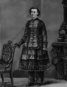 In 1849, she adopted the then-radical style of clothing known as the bloomer or reform dress — an adaptation of Turkish pantaloons with a knee-length overskirt.[2][3][4] When she applied to the Seward Seminary in Florida, she was told that she could not be admitted unless she stopped wearing the reform dress.[3] She refused and had to finish her education elsewhere.[2][4] She later recounted that this experience "anchored me in the ranks of women's rights advocates",[3] and she resolved to fight for women's "physical, political, and educational freedom and equality".[2] She wore the reform dress throughout her life, including at her wedding.[2][5]