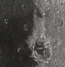 By convention these features are identified on lunar maps by placing the letter on the side of the crater midpoint that is closest to Lyell.
