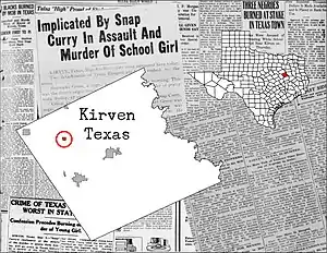 On May 4, 1922, on the last day of school in Kirvin, Texas, 17-year-old Eula Ausley was on her way home from school when she was grabbed from her horse, sexually assaulted and then horribly mutilated.[2] Her absence was noticed and a search party was sent out. They came across the body and the search party turned into a posse of 1,000 men armed with whatever weapon they had. Eula Ausley's family was in a feud with another family and the local Sheriff Horace Mayo already had two white suspects of that family in custody when the wife of McKinley "Snap" Curry told the Sheriff that he had suspiciously come home with blood on his clothes. The Sheriff changed the course of the investigation and arrested Curry. Under interrogation, he implicated two other men, Johnny Cornish (19) and Mose Jones (46).[3] The three were arrested and held in jail.