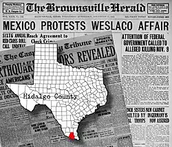 - "Mexico Protests Weslaco Affair". The Brownsville Herald. Brownsville, Cameron, Texas: Brownsville Herald Pub. Co. November 15, 1922. pp. 1–6. ISSN 0894-2064. OCLC 12903289. Retrieved March 13, 2022.