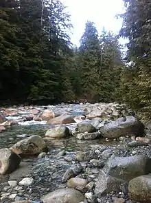 The Lynn Loop Trail is an estimated 1.5-hour trail, with a round trip distance of 5.2 km (3.2 mi).[11] This walk guides you along a slight incline adjacent to the fresh water creek, and through the mountains and forest of North Vancouver. As you walk over the bridge and past the rushing water of Lynn Creek with Mount Fromme in the backdrop, to your left there will be wooden fence where the Lynn Loop trail begins. This path parallels the Lynn Creek waters for roughly two kilometers, then loops up into a deeper part the forest with varying steep sections. Nearing the end, the incline returns to normal, bringing hikers back to the bridge area.