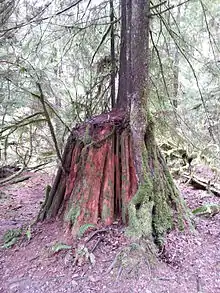 The park is covered in dense temperate rainforest that houses a wide array of organisms.[4] Like the neighbouring Lynn Canyon Park, Lynn Headwaters is a second growth forest. Cedar stumps can be seen throughout the park, reminding visitors of old logging practices. However, there remain a few scattered trees which are 600 to 700 years old and four to five meters in diameter.[5][6]