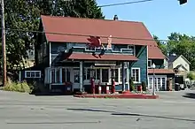 The Puget Mill Company leased out its demonstration farm in 1933 and ceased operations at Alderwood Manor later in the decade, amid declining sales during the Great Depression. At the same time, the opening of the Pacific Highway (modern-day Highway 99) in 1927 and the decline of Interurban service in the 1930s shifted the center of economic growth west near Scriber Lake. Seattle realtor Karl O'Brien filed a plat along Highway 99 at 196th Street Southwest in 1937, naming the development "Lynnwood" after his wife Lynn.[14] Nearby businesses adopted the name during the 1940s, leading to the formal use of "Lynnwood" by the chamber of commerce in 1946, instead of the suggested "West Alderwood".[6][15]