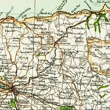 The railway has next to wind around the deep hollow in which lies Parracombe (Fox and Geese Inn) [sic], where, near the halt platform, can be seen the tower of the old church, another of those said to have been built in expiation of Thomas à Becket's murder. Hence flows the Heddon water, which one might follow down its beautiful course by the Hunter's Inn. The cyclist will find a way diverging from the main road a little beyond Parracombe. At the last station, Wooda Bay*, two miles (3 km) behind this place and its neighbour Trentishoe, the line has reached a highest point of about 1,000 feet (300 m). Beyond this, it crooks down the valley of the West Lyn (best glimpses on right hand), past Caffyn's Down Halt (for the golf links), ending some half-mile behind Lynton, and over a mile by the zig-zag road from Lynmouth.