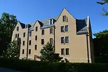 Lyons Hall was built between 1925 and 1927 as the third of three new freshman dorms built by president Walsh; Howard and Morrissey Halls had been the first two.[5] The construction of these dorms was needed to obviated the on-campus housing shortage due to the rapid increase in student population after World War I. The building of these dorms was assigned to the architecture firm of Francis W. Kervick (1883-1962) and Vincent F. Fagan (1898-1951), who were also professors at the Notre Dame department of architecture.[6] Taken together, the three halls added about 600 students on campus.[7] Because of their location, new style, and beauty, the three dorms acquired the name of "Gold Coast".[8][9]