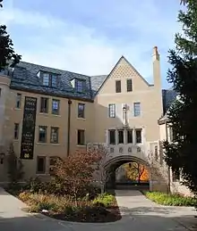 Lyons Hall is one of the 32 Residence Halls on the campus of the University of Notre Dame and one of the 14 female dorms. It is located on South Quad, and constitutes the "Golden Coast" with Morrissey Hall and Howard Hall.[2] Built in 1925-1927, it is dedicated to professor Joseph Lyons, and hosts 203 undergraduates. The coat of arms features a golden lion on a black field, representing an example of canting arms. Its arch overlooking St. Mary's lake is a campus landmark. Along with other buildings on Notre Dame's campus, it is on the National Register of Historic Places.[3][4]