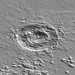Lyot crater, featuring a central peak in the middle, stands out on the flat plains of Vastitas Borealis, which is generally flat and smooth with few large craters.[2] Lyot is the deepest point in the northern hemisphere of Mars.[3] To the south are the Deuteronilus Mensae, and further to the southeast are Protonilus Mensae. To the west is the smaller Micoud crater, and to the east-southeast is Moreux crater.