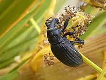 L. huttoni feeds on the speargrass species Aciphylla squarrosa, A. colensoi, and A. aurea.[3] Adults are active during the day, and are most easily found on foliage on calm, warm, sunny days, feeding on leaves and flower stalks. The weevils leave notches on the leaf edges of their host plant and sometimes eat leaves completely through.[8] Larvae burrow into the soil and feed on the Aciphylla taproot, and can be found in the surrounding dead and decomposing foliage at ground level. Evidence of their presence are dead or dying speargrass plants or deep oval notches on leaf petioles.[9] The weevil spends a year as a larva before constructing a chamber in which it pupates for two weeks.[3] After emerging, the teneral adult weevils can stay in the chamber for eight months before emerging, and live for over two years.[3][4]