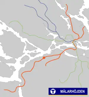 Mälarhöjden metro station is a station on the red line of the Stockholm metro, located in the district of Mälarhöjden. The station was opened on 16 May 1965 as part of the extension from Örnsberg to Sätra.[2] It is 7.5 km (4.7 mi) from the Slussen metro station.