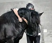 The traditional Mérens is a small, light horse, well adapted to the mountains,[6] while modern Mérens are increasingly more sporting in style.[7] The breed is known for its elegance, and in 2005 was ranked as one of the 23 most beautiful horse breeds by the French magazine Cheval Pratique.[8] Since 1948, Mérens horses must meet certain physical standards in order to be admitted to the stud book. In this time, the admission criteria have changed several times.[9] Currently, the general appearance of a Mérens is strong and compact, with energetic movement.[2][10] The Mérens, like many mountain horses, is calm, docile and hardworking.[11] The report of a comprehensive study on the heritability of the breed's temperament was published in Equ'idée in 2010.[12] It is a versatile breed, and very hardy, able to live all year outside without suffering from the weather. Mérens are known for their endurance, agility and sure-footedness.[10] They require very little care, and can survive on poor food, even when working.[11] They are resistant to cold, but react poorly to heat.[13] Mérens foals are often born in the snow, without human intervention,[14] but are usually handled and accustomed to humans from an early age.[10] They show increased resistance to the anticoagulant properties of some varieties of fern, the consumption of which can cause bloody sweats and blood in the urine in other horses.[15]