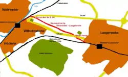 For this purpose, a new line was built that included a single-track overpass over federal highway 264 and the single-track, 285 m long Ulhaus tunnel[2] under the Langerwehe arterial road, which ends immediately before Langerwehe station. Its official opening was on 10 June 2009 and operations started on 14 June 2009.