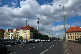 Mühlendamm (Mill Dam) is a major thoroughfare in the central Mitte district of Berlin, Germany. It runs from the historic Cölln and Fischerinsel quarters to the Molkenmarkt square of Alt-Berlin via the Mühlendammbrücke (Mill Dam Bridge) crossing the Spree river. Named after several watermills at the site, a historic causeway was first laid out at this location about 1200 and became the nucleus of the late medieval city foundation. The current prestressed concrete bridge was built in 1968. It is part of an east–west road link to Berlin's city centre and the Bundesstraße 1 highway.