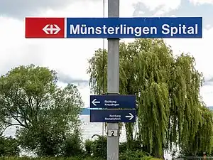 Münsterlingen Spital railway station (German: Bahnhof Münsterlingen Spital) is a railway station in Münsterlingen, in the Swiss canton of Thurgau. It is an intermediate stop on the Lake line and is served as a request stop by local trains only. It is one of three stations in the municipality of Münsterlingen.