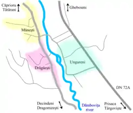 It is composed of three villages: Drăgăești-Pământeni (colloquially "Drăgăești"), Drăgăești-Ungureni (colloquially "Ungureni") and Mănești. Mănești and Drăgăești are on the right bank of the Dâmbovița River, while Ungureni is on the left bank.
