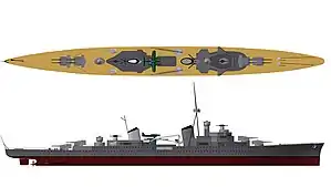 All six ships were to have steel-made, and up to 85% welded construction. The design called for fifteen watertight compartments and a double bottom for 78% of the length of the hull. The ships had a crew of 28 officers and 892 men. They were designed to carry one picket boat, a barge, a launch, and two cutters. They would have carried a pair of Arado Ar 196 seaplanes for reconnaissance, which would have been launched with a single steam catapult.[4]