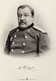 Pevtsov was born in Ustiuzhinskii district, Novgorod province in the estate of a noble family. Orphaned at seven he was raised by relatives in St. Petersburg where he went to the First St Petersburg High School before joining cadet school in Voronezh. Excelling in mathematics and geography, he caught the attention of General Baron A. I. Delvig who suggested that he joined the Nicholas General Staff Academy. He joined the 29th Infantry Tomsk Regiment stationed in Tula in 1862 and was transferred to Poland to suppress the uprising there. It was in Warsaw that he met Maria Renast whom he later married. While in St Petersburg he attended meetings of the Imperial Russian Geographical Society, becoming a member of it in 1867. In 1868 he joined the Nicholas General Staff Academy. In 1875 he was posted to Omsk under General I.F. Babkov. Here he studied Kazakh and Arabic. In 1876 he led the First Dzhungarian Expedition. Pevtsov made astronomical and meteorological observations in his travels and helped produce maps. In 1878 he led expeditions into western Mongolia and the northern regions of China. In 1889 he travelled to Tibet. After the death of N.M. Przewalski, he took over command. He was accompanied by V.I. Roborovsky and P.K. Kozlov. He suffered from poor health in later years and ran into debts. He died in St Petersburg and was buried in Smolensk cemetery.[1]