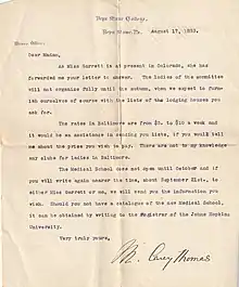 Thomas went to Sage College, the women's school at Cornell University, in September, 1875, where she formally changed her first name to Carey. She graduated from Cornell University in 1877. Cornell offered her both the position of professor of literature and dean of Sage College, but she did not consider either.[1] She did graduate work in Greek at Johns Hopkins University, but withdrew because she was not permitted to attend classes. She did further graduate work at the University of Leipzig, but that university did not grant degrees to women. She then went to the University of Zurich and earned a Ph.D. in linguistics, summa cum laude, in 1882 for her dissertation, which was a philological analysis of Sir Gawain and the Green Knight. This dissertation continued to be highly regarded by specialists eighty years later.[2]