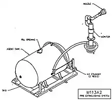Welded to the skid was a tank which could hold 250 US gallons (946 litres) of mixed water/fire suppressant, to be delivered to an externally mounted water monitor (deluge gun) at between 200 and 240 psi. The tank was fitted with a 4” (101.6mm) cap on the top for easy refilling and a drainage valve was located on the bottom. The fire suppressant liquid was pressurised by two 220 cubic foot (6.23 m³) nitrogen or compressed air cylinders operating at 2,000 psi, which would deliver the suppressant at 150 to 200 gallons per minute. Replacement of the propellant cylinders and refilling the water and fire-suppressant tank took 7 to 10 minutes. Fitting the skid in the cargo cabin necessitated the removal of the personnel heater system and the rear-facing seat on the commander’s station. The skid was bolted to the vehicle's floor plate.