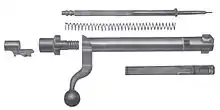 The rifle maintains the British cock-on-closing feature, in which the bolt's mainspring is loaded and the rifle cocked as part of the return stroke of the bolt, which aided rapid fire, especially as the action heated up. Most bolt action designs after the Mauser 98 cocked as part of the opening stroke. The rifle has a characteristic "belly" due to a deeper magazine, allowing the rifle to hold six rounds of the US .30-06 cartridge in the magazine, and one in the chamber. The M1917 Enfield like the Mauser Gewehr 98 had no magazine cut-off mechanism, which when engaged permits the feeding and extraction of single cartridges only while keeping the cartridges in the magazine in reserve. In a manufacturing change from the Mauser 98 and the derivative Springfield, the bolt is not equipped with a third 'safety' lug. Instead, as on the earlier Model 1895 (Chilean) Mauser, the bolt handle recesses into a notch in the receiver, which serves as an emergency locking lug in the event of failure of the frontal locking lugs. This change saved machine time needed on the rifle bolt, cutting costs and improving production rates, and this alteration has since been adopted by many commercial bolt-action rifle designs for the same reasons. The unusual 'dog-leg' shaped bolt handle is low profile and places the bolt knob just rearwards of the trigger close to the firer's hand, facilitating rapid cycling and fire. Like the Lee–Enfield, P13 and P14, the safety falls under the firer's thumb and can be operated silently. The M1917 Enfield bolt locking lugs had a 4 degree helical angle with matching angles on the receiver lug seats (the technical term is interrupted threading). This means that final head space is not achieved until the bolt handle is turned down all the way. The design probably used helical locking lugs to allow for chambering imperfect or dirty ammunition and that the closing cam action is distributed over the entire mating faces of both bolt and receiver lugs. This is one reason the bolt closure feels smooth. The angled lugs had no tendency to unwind with chamber pressure since the "angle of repose" of smooth, lubricated steel surfaces is approximately 8 degrees. One advantage was that when the bolt handle was turned up the lugs cleared each other immediately so full effort was applied to the extraction cam. The trigger had a mechanical interlock to prevent firing unless the bolt was fully locked. The location of the safety on the right rear of the receiver has also been copied by most sporting bolt-action rifles since, as it falls easily under the firer's thumb. The trigger pull is ≥ 3 lbf (13.3 N). One notable design flaw was the leaf spring that powered the ejector, which could break off and render the ejector inoperable. A combat-expedient repair method was to slip a bit of rubber under the bolt stop spring.[18] A redesigned ejector, incorporating a small coil spring in place of the fragile leaf spring, was developed and can be fitted to the M1917 to remedy this issue.