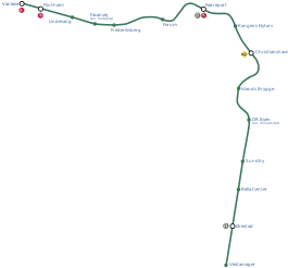 M1 starts at Vanløse, where there is transfer to the S-train's lines C and H.[9] The line starts elevated and is located in fare zone 2.[10] The borough of Vanløse is mostly a residential area.[9] The line then runs into the enclave municipality of Frederiksberg, running parallel to the Frederikssund Line of the S-train. At Flintholm, there is transfer to the C, F and H-lines of the S-train. Flintholm is the country's third-largest public transport hub. The station is located at the Grøndal Park, and is the borderline between the urban and suburban Copenhagen.[11] The area around Lindevang is a redeveloped industrial area, that now is mostly residential, in addition to hosting the Copenhagen Business School.[12]