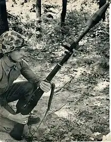 The M1907 two-piece leather rifle sling was the most common type of sling used with the weapon through World War II. In 1942, an olive drab canvas sling was introduced that gradually became more common.[55] Another accessory was the winter trigger, developed during the Korean War.[56] It consisted of a small mechanism installed on the trigger guard, allowing the soldier to remotely pull the trigger by depressing a lever just behind the guard.[56] This enabled the shooter to fire his weapon while using winter gloves, which could get "stuck" on the trigger guard or not allow for proper movement of the finger.[56]