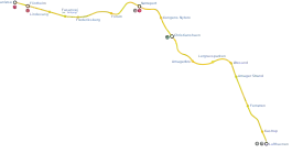 Amagerbro is located in the borough of Amager Øst, and is the first station on the island of Amager. The surrounding area combines a residential area with night life and many shops.[22] Lergravsparken is surrounded by an older, dense residential area, although it has experienced commercial growth after the metro arrived.[23] After Lergravsparken, the line emerges and runs on an embankment or elevated the rest of the way to the airport.[14] The line also enters the municipality of Tårnby and passes into fare zone 3.[11] Øresund is located in an industrial area, and is one of only four stations to have no bus service.[24]