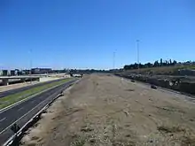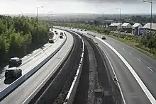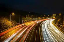 Most of these interchanges were subject to high levels of traffic congestion, as was the former toll-plaza north of the West-Link bridge. The busier roundabout junctions were signal-controlled, with tailbacks extending for several kilometres at rush hour. The most infamous was the Red Cow roundabout junction with the N7, formerly dubbed the "Mad Cow Roundabout".[1] As well as being the junction of two of the busiest roads in the State, the Luas tram Red Line from Tallaght to the city centre used to cross two slip roads at-grade, before continuing city-bound in the median of the R110 (formerly N7). As part of the M50 upgrade works (see below), these at-grade crossings were removed, and in December 2008, the completely reconstructed interchange was open. This greatly reduced the congestion at the once-notorious traffic black-spot.