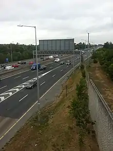 The M50 motorway (Irish: Mótarbhealach M50) is a C-shaped orbital motorway in Dublin and the busiest motorway in Ireland. The current route was built in various sections over the course of 27 years, from 1983 to 2010. It begins at Dublin Port, running northward through the Dublin Port Tunnel and along a portion of the Airport Motorway. It then turns west at its junction with the M1, circling the northern, western and southern suburbs of Dublin, before merging with the M11 at Shankill in South East Dublin. The road forms part of European route E01.