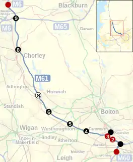 M61 highlighted in blue ![]() Shown in North West England ![]() Shown with the UK motorway network ![]() Junctions of the M61 | ||||