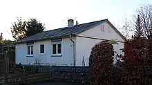 The architectural design resembled conventional stone buildings: The perforated facade with a gable roof and mullioned windows with shutters were "quite plain, but cosy and with all objectivity something for the German mind" as required in the specification by the architect Hans Schneider on behalf of MAN in 1949.[3] The basic type could be ordered according to the catalogue with different roof pitches. The inner walls could be built individually, since the roof was supported by the outer walls. The version with the steeper roof provided space for a habitable attic.[4]