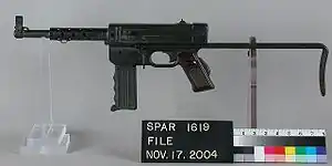 ![]() MAT-49 on display. This weapon has the front grip lowered in firing position, but lacks a magazine. | |