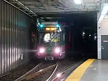 The Green Line is a light rail system run by the Massachusetts Bay Transportation Authority (MBTA) in the Boston, Massachusetts, metropolitan area. It is the oldest MBTA subway line, and with tunnel sections dating from 1897, the oldest subway in North America.[4] It runs underground through downtown Boston, and on the surface into inner suburbs via six branches on radial boulevards and grade-separated alignments. With an average daily weekday ridership of 137,700 in 2019, it is the third most heavily used light rail system in the country.[1] The line was assigned the green color in 1967 during a systemwide rebranding because several branches pass through sections of the Emerald Necklace of Boston.[5][6][7]