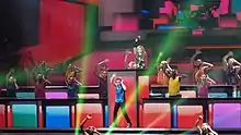 The opening act, "Girl Gone Wild", took place in a "photo realistic church", for which the team of Moment Factory created a matte painting of an ornate 3D cathedral.[41][42] Shooting for the visuals used for the track "Gang Bang", which showed blood being spattered, lasted three days and took place in Montreal.[14] For the performance of "I'm a Sinner", the singer wanted to capture a "psychedelic journey", thus Moment Factory travelled to India and filmed from the back of a train.[14] Finally, visuals for "Celebration" were described as a "full-blown spectacle of color and movement".[42] Tom Munro and Johan Söderberg created a video that morphed Madonna's face with a number of famous figures, including then-Chinese President Hu Jintao, US Republican former vice presidential candidate Sarah Palin and Pope Benedict XVI.[43][44] Used for the song "Nobody Knows Me", the singer explained the video was about "intolerance that we human beings have for one another. And how much we judge people before knowing them".[45] Munro also created a video of Madonna hiding from a gang of masked clowns in a luxurious hotel room, projected on the number "Justify My Love".[46][47] For the "Express Yourself"/"Born This Way" mashup, Madonna used imagery of Roy Lichenstein and a video of monsters swallowing cans emblazoned with images of the corset and ponytail from her Blond Ambition World Tour and David Bowie's Aladdin Sane lightning bolt;[48] this was seen as Madonna taking a "deliberate shot" at Gaga by Slant's Sal Cinquemani, as "monsters" is how Gaga refers to her fanbase.[49] The logo for the magazine of the same name flashed on screens during the performance of "Vogue".[37] Videos of Lil Wayne, Nicki Minaj and M.I.A. were used on the performances of "Revolver", "I Don't Give A", and "Give Me All Your Luvin'", respectively.[47][33]
