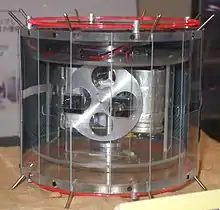 MINERVA-II-1 was developed by JAXA and the University of Aizu. It has a slim design compared to its predecessor, to increase the likelihood the surface with larger area would contact the asteroid surface. MINERVA-II-1 was enlarged from its predecessor as the rover's destination, asteroid Ryugu was more distant from the Sun than Itokawa, necessitating an increase in solar cell area.[12] Ryugu's greater size compared to Itokawa means rovers will face stronger gravity, thus larger DC motors are used for MINERVA-II-1.[13] By deploying two rovers simultaneously, a network of space probes can be achieved.[9] The maximum communication speed between the MINERVA-II-1 rovers and the mothership's OME-E is 32 kbps. The two rovers are nearly identical, the only difference being some internal sensors and the thermal characteristics.[14] Rover-1A uses a traditional multi-layer insulation, which covers the rover to prevent heat from entering, while Rover-1B is equipped with radiators to dissipate heat to the outside.