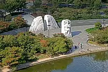 The Martin Luther King, Jr. Memorial is a national memorial located in West Potomac Park next to the National Mall in Washington, D.C., United States.[1] It covers four acres (1.6 ha) and includes the Stone of Hope, a granite statue of Civil Rights Movement leader Martin Luther King Jr. carved by sculptor Lei Yixin. The inspiration for the memorial design is a line from King's "I Have a Dream" speech: "Out of the mountain of despair, a stone of hope." The memorial opened to the public on August 22, 2011, after more than two decades of planning, fund-raising, and construction.[2][3]